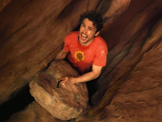There were a lot of moments that really got to me in the movie. When Aron, starting to become hopelessly delirious, pretends that he is interviewing himself on a talk show, I got so sad. Though the scene is done in a humorous way, it has the exact opposite effect because Aron is admitting to himself his own stupidity and feeling of invincibility. They say all us young'uns have it, the feeling that we'll live another day to make more mistakes or correct the old ones, but the boulder teaches Aron that maybe he's not been living his life the best way for himself.
